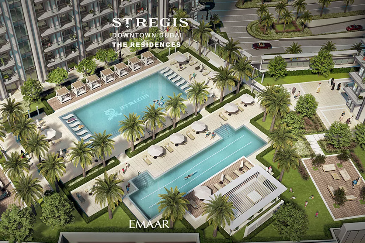 The St. Regis Residences, Downtown Dubai boasts an ultra-modern landscaped podium that connects the buildings. With world-class amenities and a pool deck offering great views over the Dubai Opera promenade, the platform ensures urban-resort-quality surroundings where residence owners can unwind, relax, and recharge